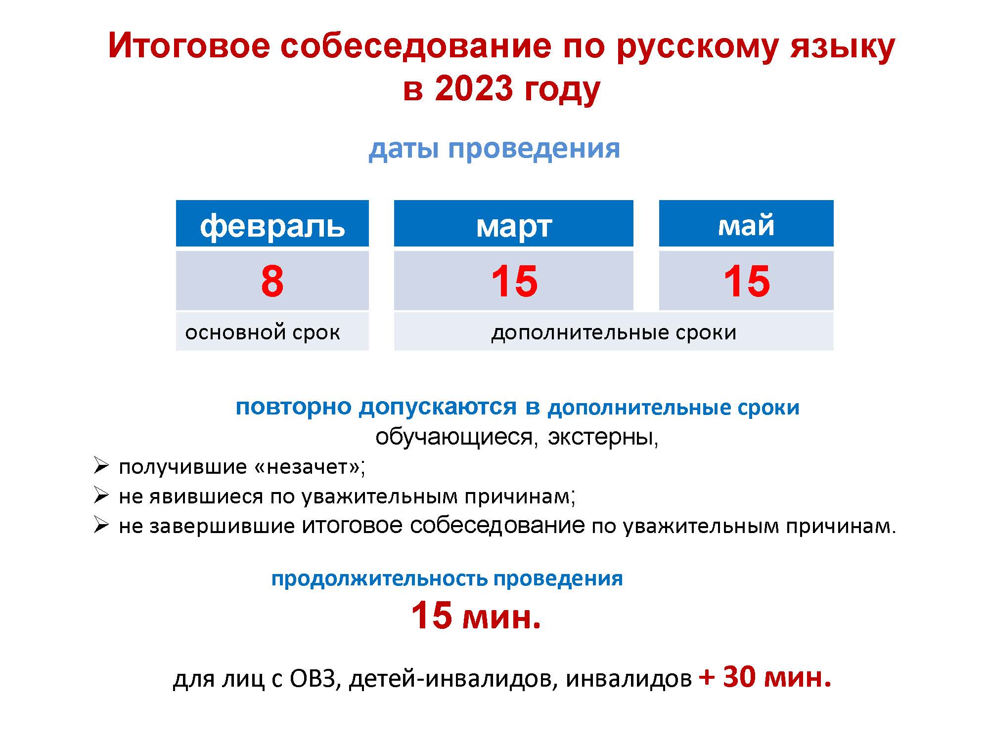 Основной срок проведения итогового собеседования по русскому языку в этом году - 8 февраля. Для девятиклассников, получивших «незачет», либо не явившихся на собеседование или не завершивших собеседование по уважительным причинам, предусмотрены дополнительные дни – 15 марта и 15 мая.