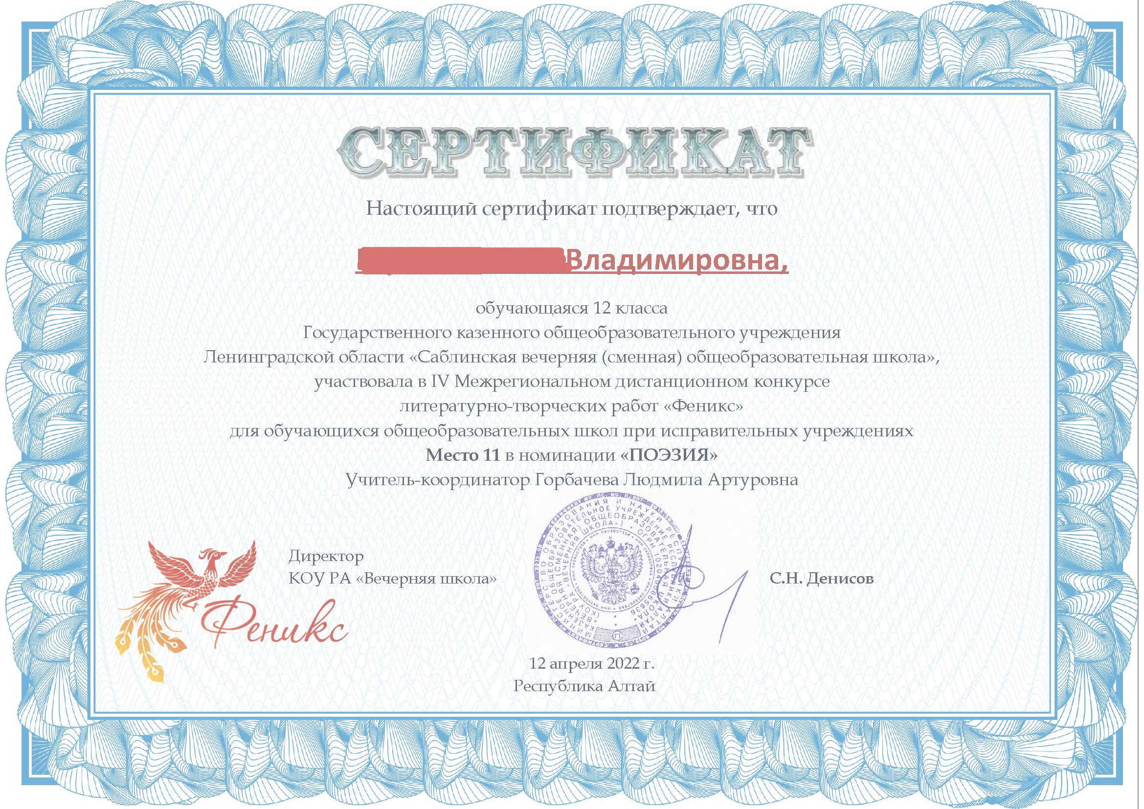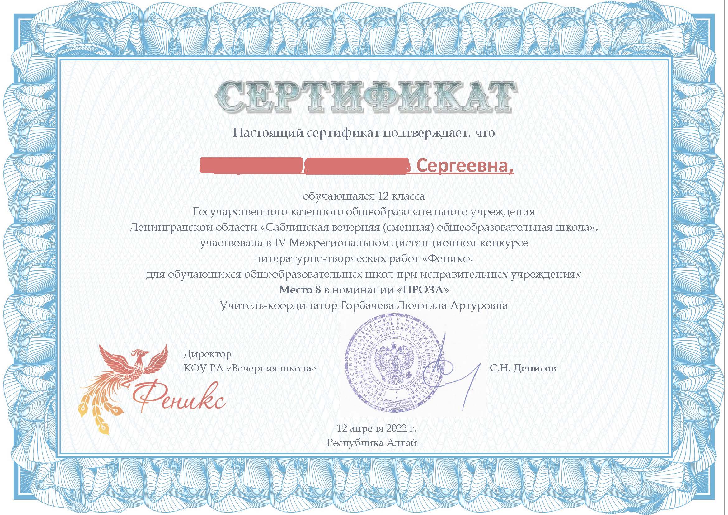 В 2022 году ученики нашей школы впервые участвовали в IV Межрегиональном дистанционном конкурсе литературно-творческих работ «Феникс» для обучающихся общеобразовательных школ при исправительных учреждениях, организованном казенным общеобразовательным учреждением Республики Алтай «Вечерняя (сменная) общеобразовательная школа».