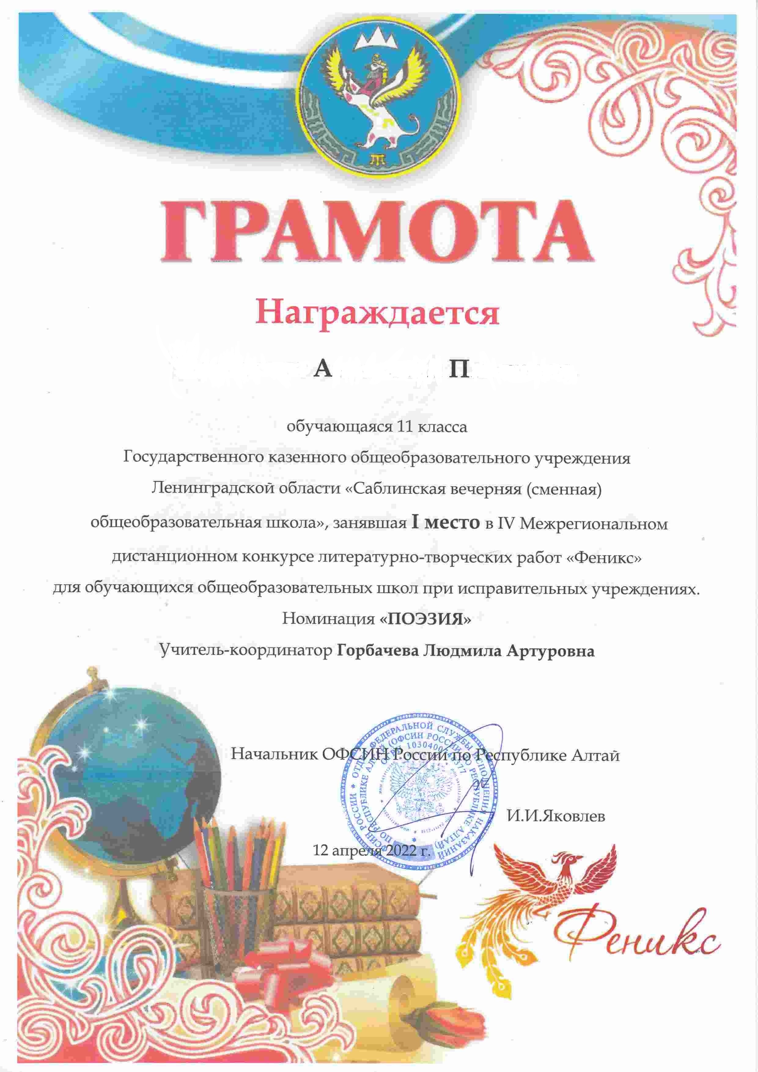 В январе 2024 года обучающиеся ГКОУ ЛО «Саблинская вечерняя школа» приняли участие в VI Межрегиональном дистанционном конкурсе литературно-творческих работ «Феникс» для обучающихся общеобразовательных школ при исправительных учреждениях, организованном казенным общеобразовательным учреждением Республики Алтай «Вечерняя (сменная) общеобразовательная школа» с. Маймы Майминского района при содействии ОФСИН России по Республике Алтай.