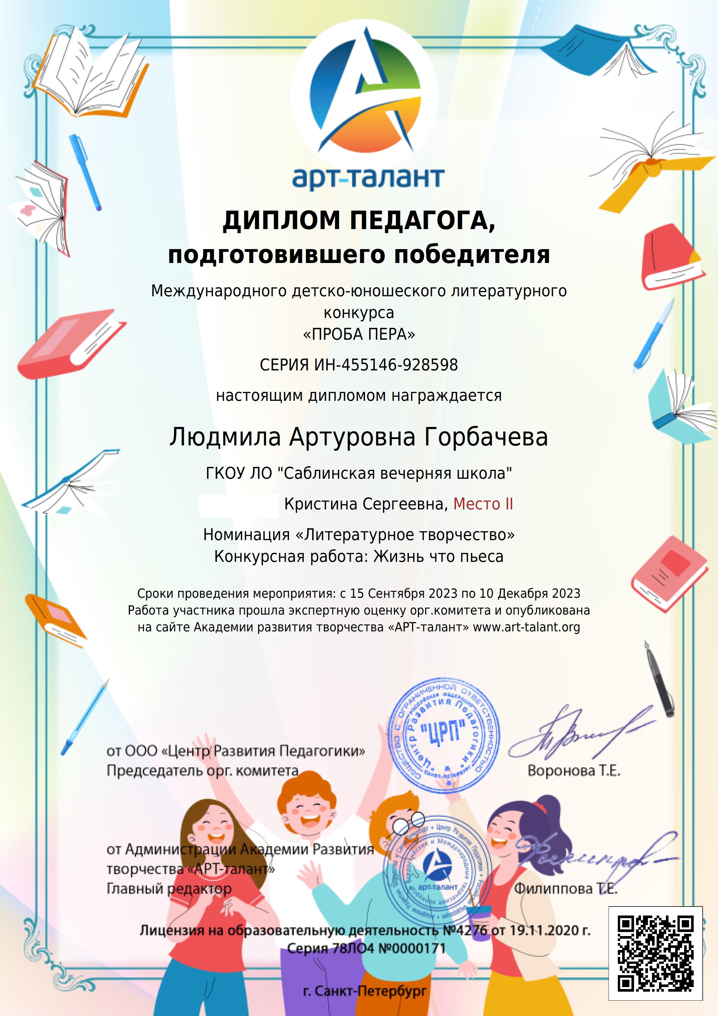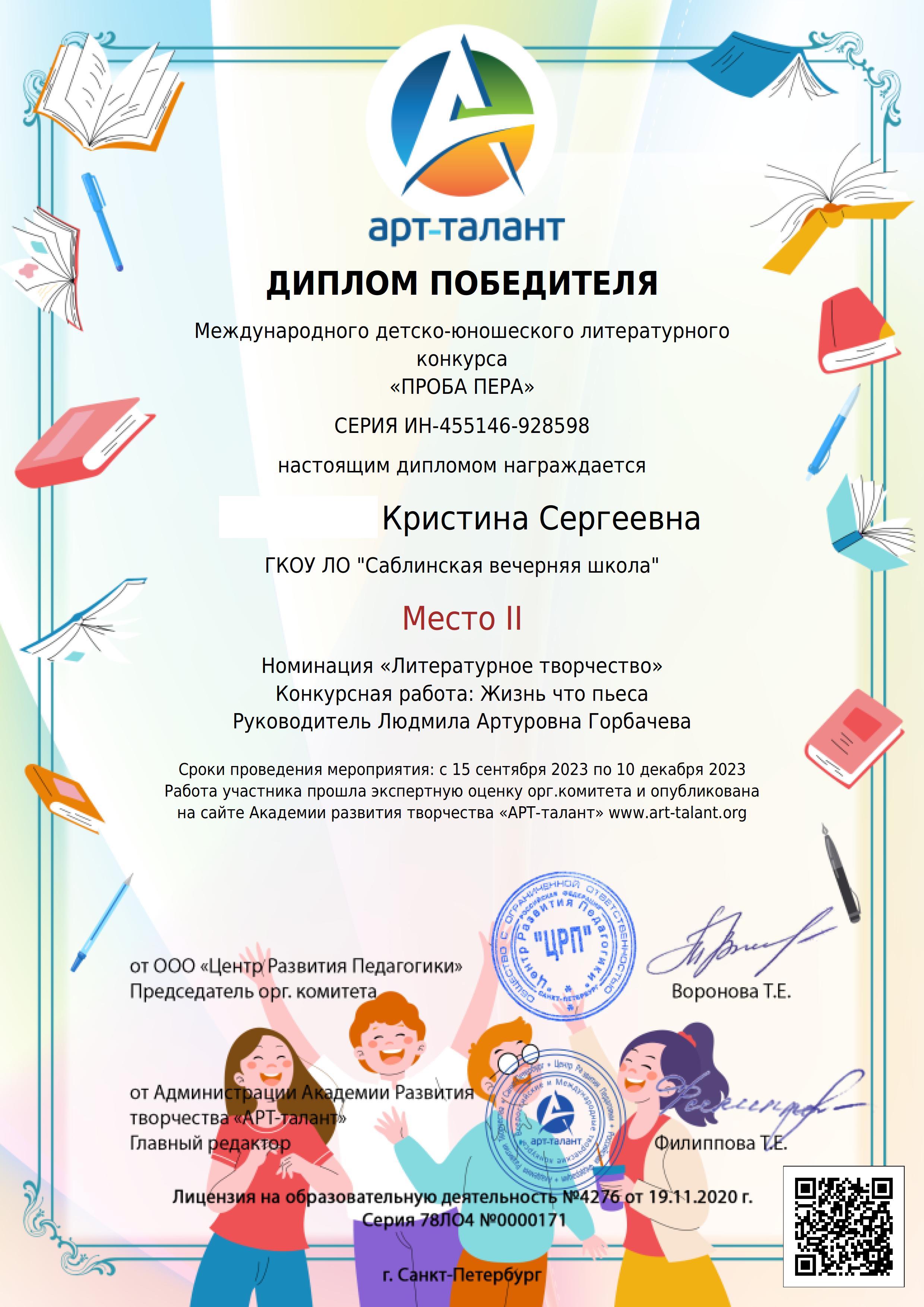 В декабре 2023 года впервые обучающиеся ГКОУ ЛО «Саблинская вечерняя школа» участвовали в международном детско-юношеском литературном конкурсе «Проба пера». Девушки пробовали свои силы в номинации «Литературное творчество». Жюри высоко оценило работы наших участниц. Конкурсанткам были присвоены 1 и 2 места.